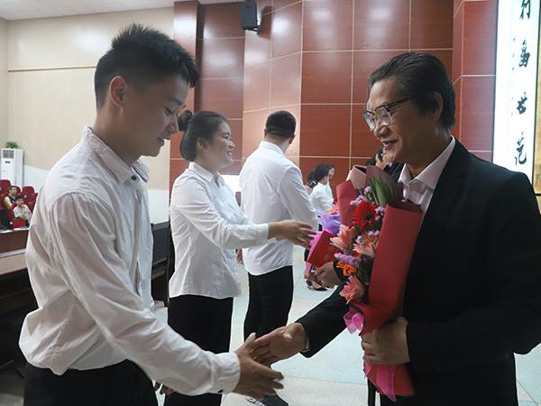 徒弟们怀以诚心,以鲜花、茶水为礼,向师傅献上自己的敬意;师傅们担下重任,回赠寄语,勉励徒弟黾勉好学,不忘初心。