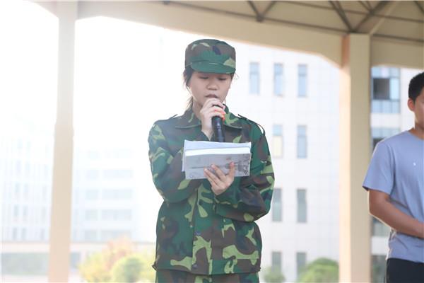 2002班王羽彤同学代表发言,她表示在本次军事训练中一定刻苦训练,以刚硬代替稚气,以坚强战胜懦弱,以自立取代依赖,把坚韧顽强的作风、严明的纪律带到生活和学习中。